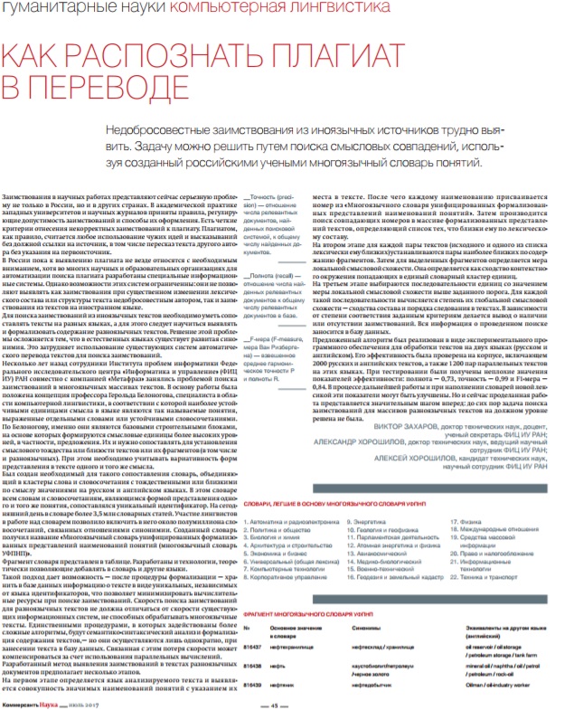 Несколько лет назад сотрудники Института проблем информатики Федерального исследовательского центра "Информатика и управление" (ФИЦ ИУ) РАН совместно с компанией "Метафраз" занялись проблемой поиска заимствований в многоязычных массивах текстов. В основу работы была положена концепция профессора Герольда Белоногова, специалиста в области компьютерной лингвистики, в соответствии с которой наиболее устойчивыми единицами смысла в языке являются так называемые понятия, выраженные отдельными словами или устойчивыми словосочетаниями. По Белоногову, именно они являются базовыми строительными блоками, на основе которых формируются смысловые единицы более высоких уровней, в частности, предложения. Их и нужно сопоставлять для установления смыслового тождества или близости текстов или их фрагментов (в том числе и разноязычных). При этом необходимо учитывать вариативность форм представления в тексте одного и того же смысла.Был создан необходимый для такого сопоставления словарь, объединяющий в кластеры слова и словосочетания с тождественными или близкими по смыслу значениями на русском и английском языках. В этом словаре всем словам и словосочетаниям, являющимся формой представления одного и того же понятия, сопоставлялся уникальный идентификатор. На сегодняшний день в словаре более 3,5 млн словарных статей. Участие лингвистов в работе над словарем позволило включить в него около полумиллиона словосочетаний, связанных отношениями синонимии. Созданный словарь получил название "Многоязычный словарь унифицированных формализованных представлений наименований понятий (многоязычный словарь УФПНП)".