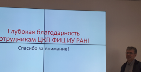 В соответствии с планом были заслушаны и обсуждены доклады зам. директора д.т.н., проф. А.А. Зацаринного «Цифровая платформа ФИЦ ИУ РАН для научных исследований», начальника УИТС ФИЦ ИУ РАН В.А. Кондрашева «О предоставлении доступа научных коллективов к услугам Гибридного высокопроизводительного вычислительного комплекса (ГВВК) ФИЦ ИУ РАН».