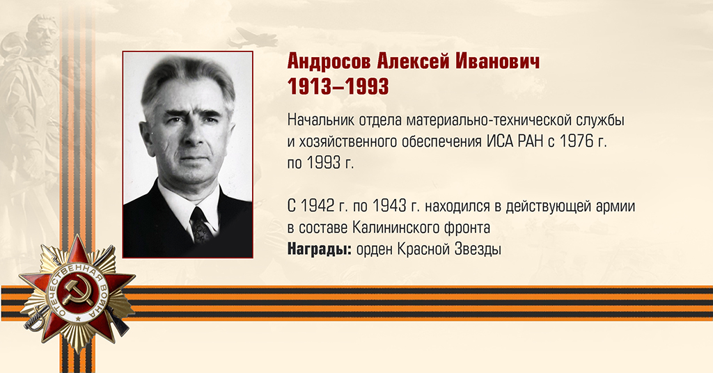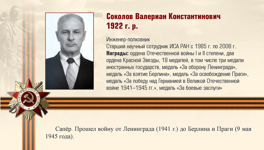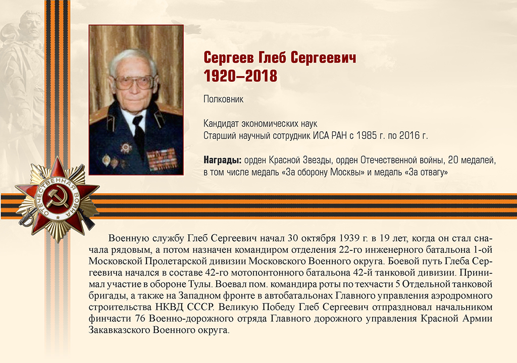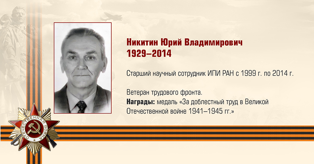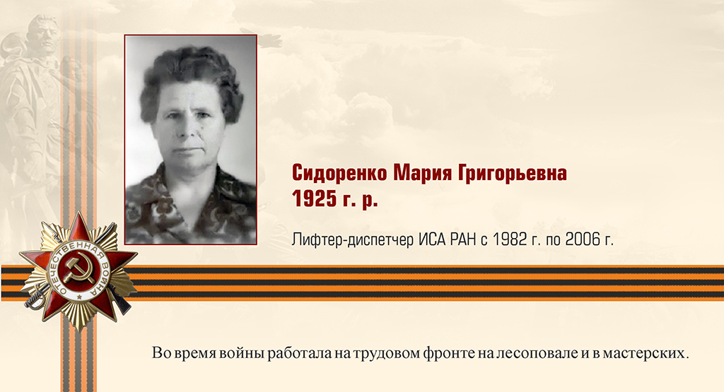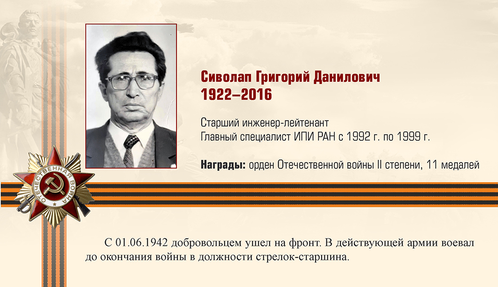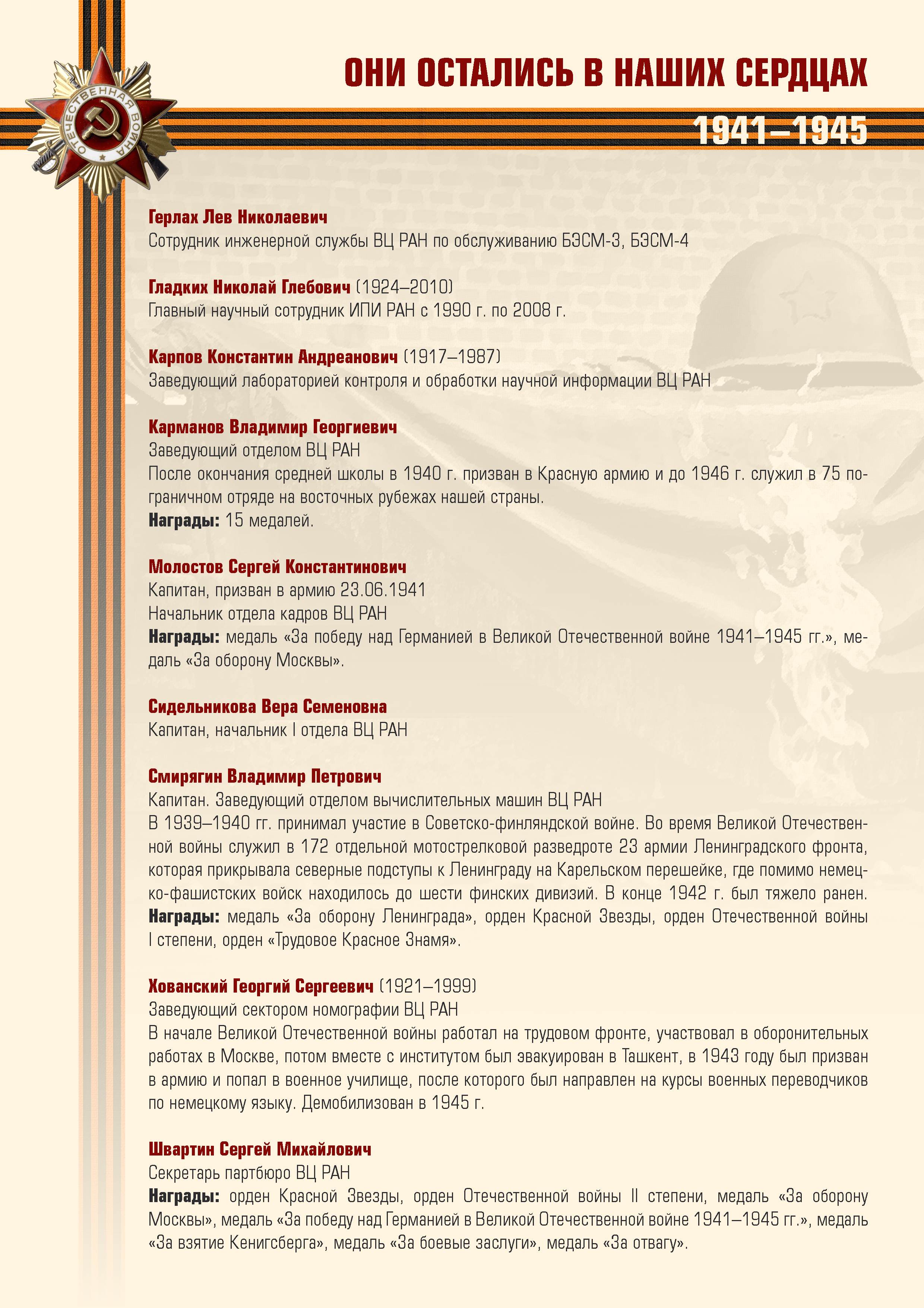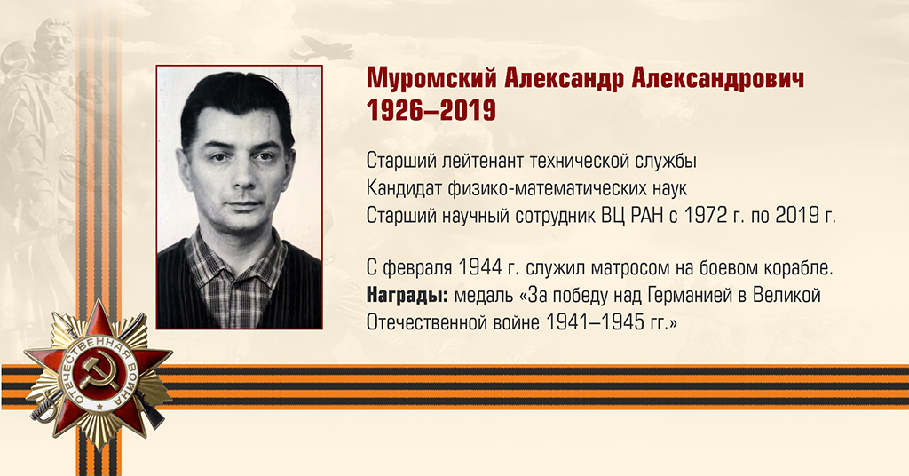 В этом году исполняется 80 лет со дня Победы, которая навсегда вписана в историю человечества. В этом разделе собраны сведения об участниках Великой Отечественной войны, которые помогли фронту или на поле боя, или в тылу, а после окончания войны были сотрудниками  ВЦ РАН, ИСА РАН и ИПИ РАН.