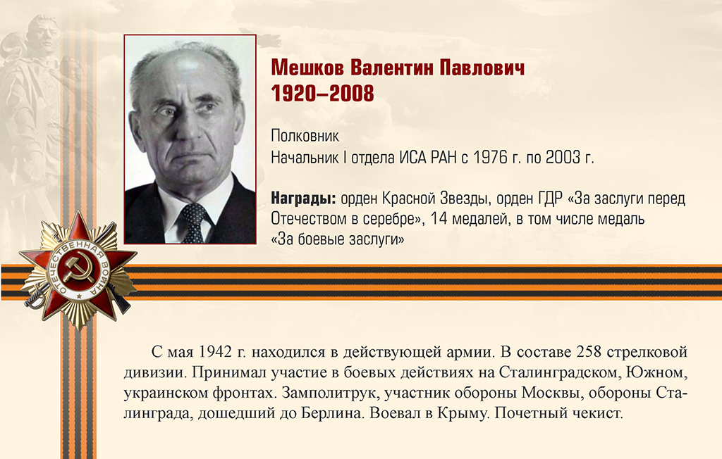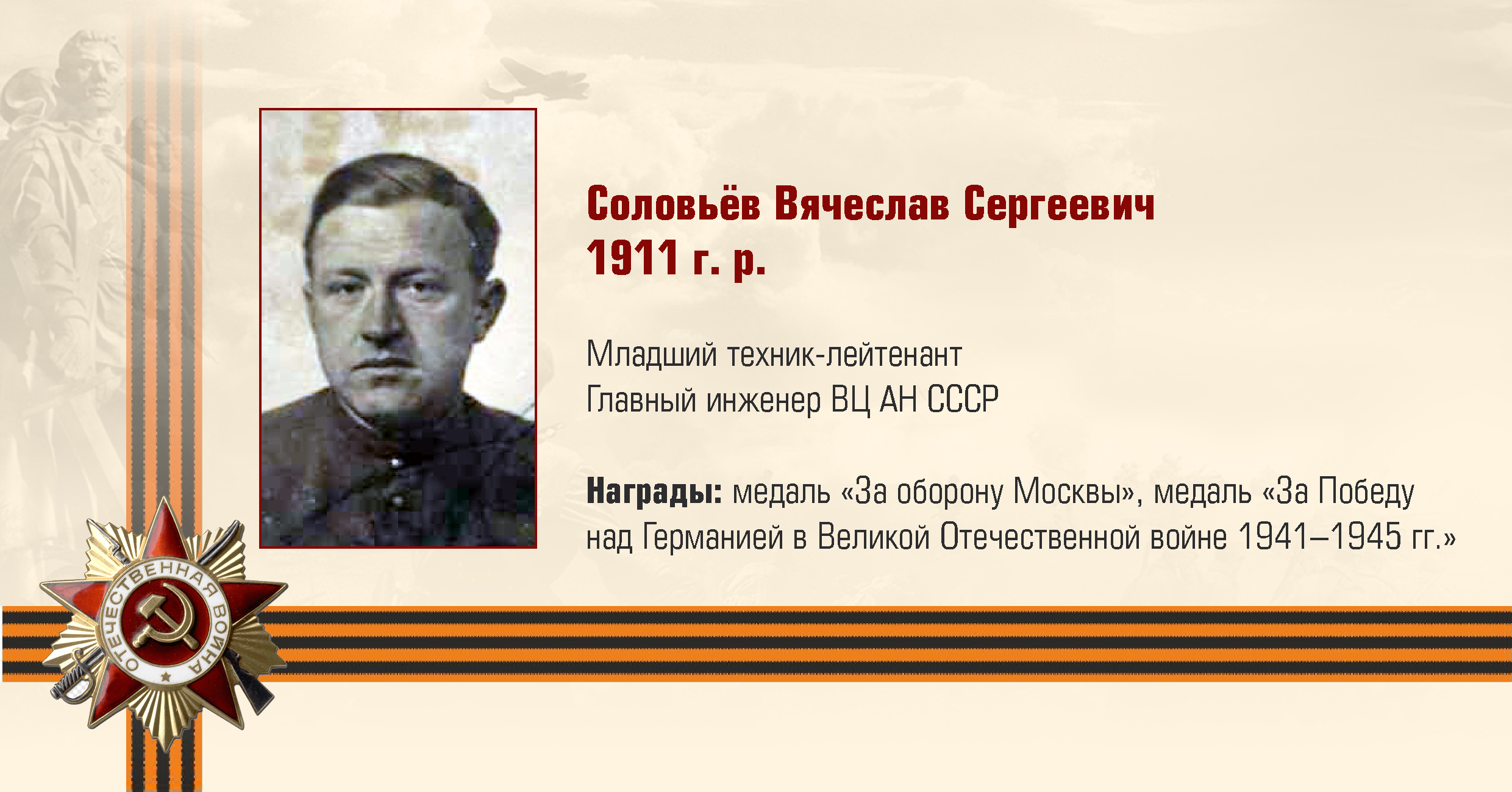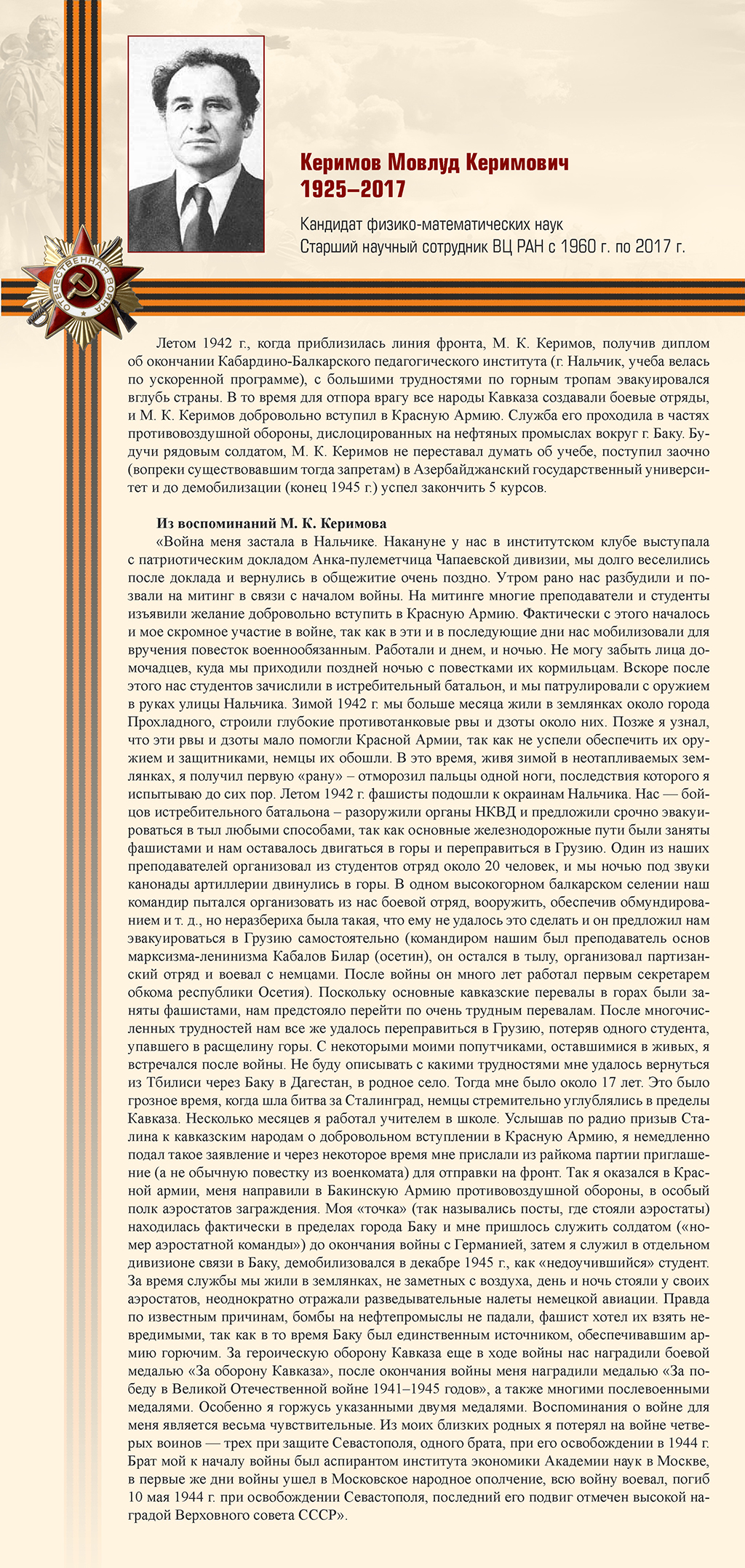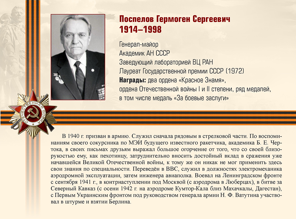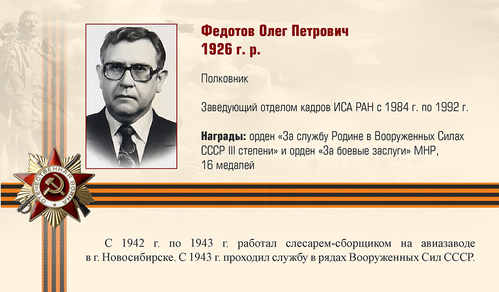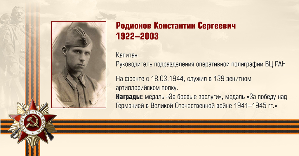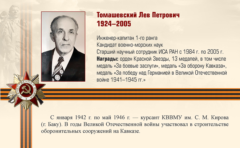 В этом году исполняется 80 лет со дня Победы, которая навсегда вписана в историю человечества. В этом разделе собраны сведения об участниках Великой Отечественной войны, которые помогли фронту или на поле боя, или в тылу, а после окончания войны были сотрудниками  ВЦ РАН, ИСА РАН и ИПИ РАН.