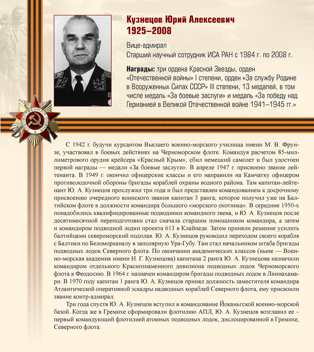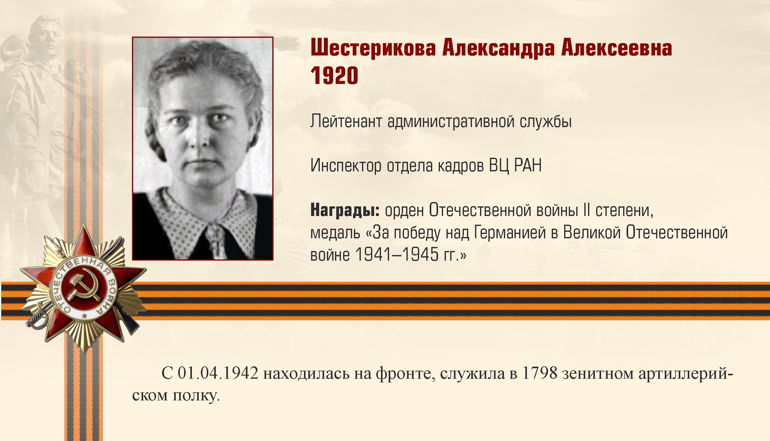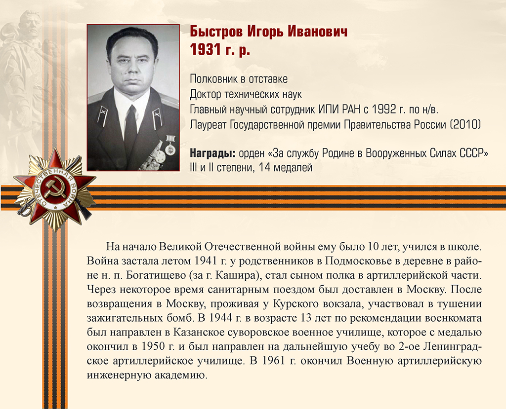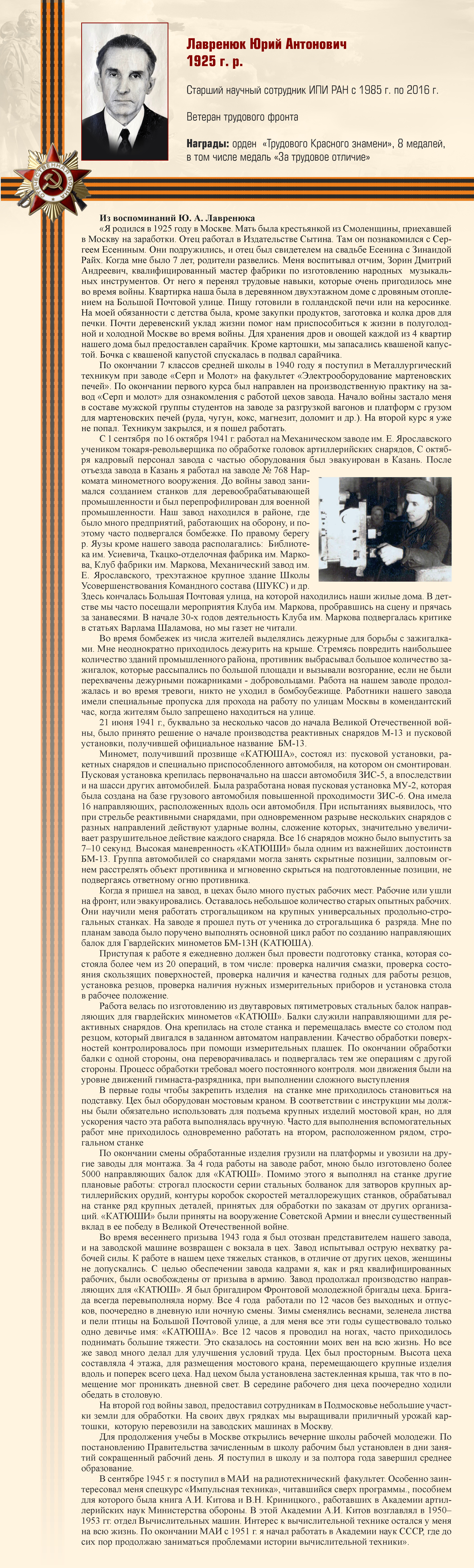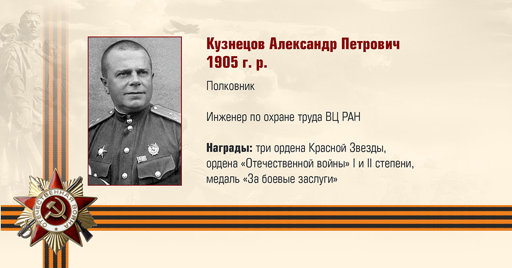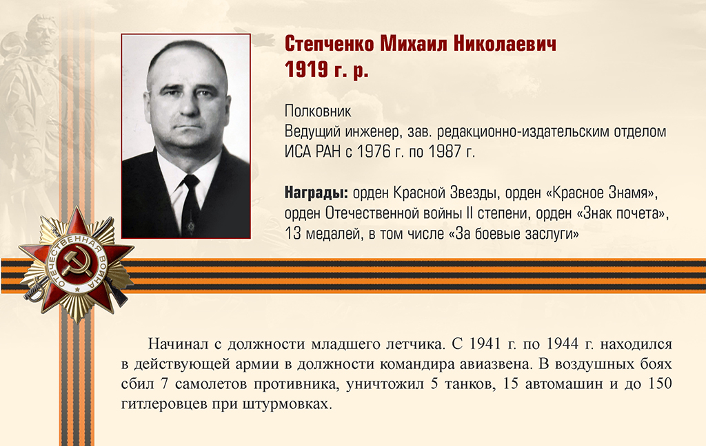 В этом году исполняется 80 лет со дня Победы, которая навсегда вписана в историю человечества. В этом разделе собраны сведения об участниках Великой Отечественной войны, которые помогли фронту или на поле боя, или в тылу, а после окончания войны были сотрудниками  ВЦ РАН, ИСА РАН и ИПИ РАН.
